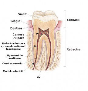 [/fusion_imageframe][/fusion_builder_column][fusion_builder_column type=”2_3″ last=”yes” spacing=”yes” background_color=”” background_image=”” background_repeat=”no-repeat” background_position=”left top” border_size=”0px” border_color=”” border_style=”” padding=”” class=”” id=””][fusion_title size=”3″ content_align=”left” style_type=”single solid” sep_color=”” class=”” id=””]Ce este un tratament endodontic?[/fusion_title][fusion_text]Tratamentul endodontic se refera la tratarea canalelor dintilor si mai poarta denumirea de tratament endodontic. “Endo” este un cuvant grecesc si inseamna inauntru iar “odont” este cuvantul grecesc pentru dinte. Deci tratamentul endodontic trateaza interiorul dintelui.[/fusion_text][fusion_text]Pentru intelegerea tratamentului endodontic sunt necesare cateva notiuni despre anatomia dintelui. In interiorul dintelui, sub stratul alb de smalt si sub cel de tesut dur numit dentina se gaseste un tesut moale numit pulpa. Pulpa dentara contine vase de sange, nervi si tesuturi adiacente. Pulpa dentara se intinde de la coroana dintelui pana la varfurile radacinilor unde se conecteaza cu tesuturile care inconjoara dintele.[/fusion_text][/fusion_builder_column][/fusion_builder_row][/fusion_builder_container][fusion_builder_container backgroundcolor=”” backgroundimage=”” backgroundrepeat=”no-repeat” backgroundposition=”left top” backgroundattachment=”scroll” video_webm=”” video_mp4=”” video_ogv=”” video_preview_image=”” overlay_color=”” overlay_opacity=”0.5″ video_mute=”yes” video_loop=”yes” fade=”no” bordersize=”0px” bordercolor=”” borderstyle=”” paddingtop=”20px” paddingbottom=”20px” paddingleft=”0px” paddingright=”0px” menu_anchor=”” equal_height_columns=”no” hundred_percent=”no” class=”” id=””][fusion_builder_row][fusion_builder_column type=”3_4″ last=”no” spacing=”yes” background_color=”” background_image=”” background_repeat=”no-repeat” background_position=”left top” border_size=”0px” border_color=”” border_style=”” padding=”” class=”” id=””][fusion_accordion class=”” id=””][fusion_toggle title=”De ce as avea nevoie de un tratament endodontic?” open=”no”]Tratamentul endodontic este necesar cand pulpa dentara (tesutul moale din interiorul canalului dentar) devine inflamata sau infectata. Inflamatia sau infectia poate avea o mare varietate de cauze: carie adanca, proceduri dentare repetate pe dinte, o fractura sau o fisura dentara. De asemenea, un traumatism(molarul de minte care nu are loc sa erupa poate traumatiza dintele vecin sau un dinte la distanta) asupra dintelui poate determina leziuni pulpare chiar daca dintele nu are semne vizibile de fractura sau fisura. Daca inflamatia sau infectia pulpei nu este tratata ea poate provoca dureri foarte mari sau poate duce la un abces dentar si in final la pierderea dintelui.[/fusion_toggle][fusion_toggle title=” De unde stiu ca am nevoie de un tratament endodontic?” open=”no”]Aveti nevoie de un tratament endodontic daca aveti durere, sensibilitate prelungita la rece si la cald, sensibilitate la atingere si mestecat, decolorarea dintelui, umflatura in dreptul acestuia, umflarea unor ganglioni din jurul gatului si al capului, etc. Cateodata insa pot sa nu existe simpome de nici un fel si se descopera intampator radiologic.